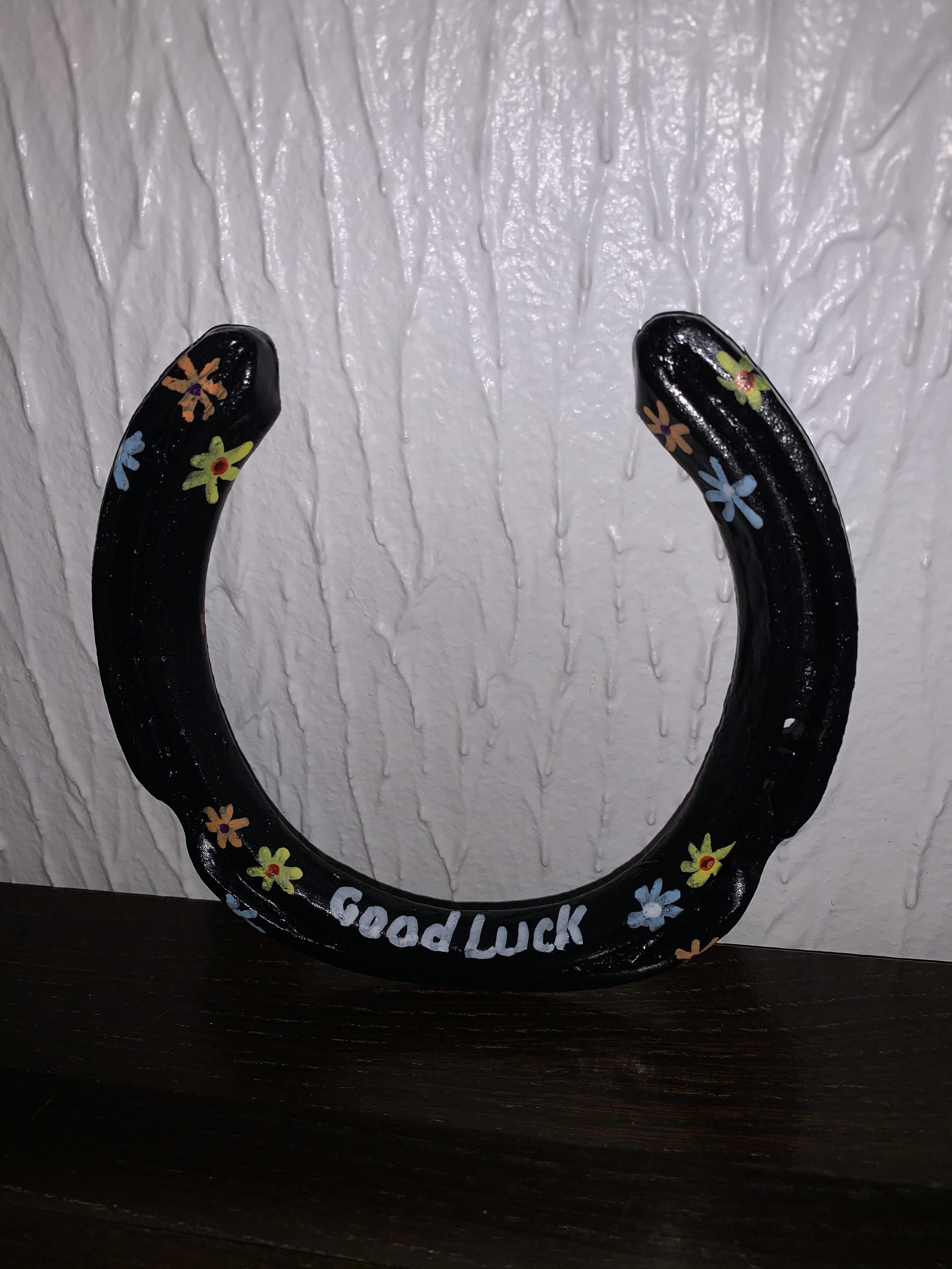 Good Luck Horseshoe. Black with Good Luck and coloured flowers.
