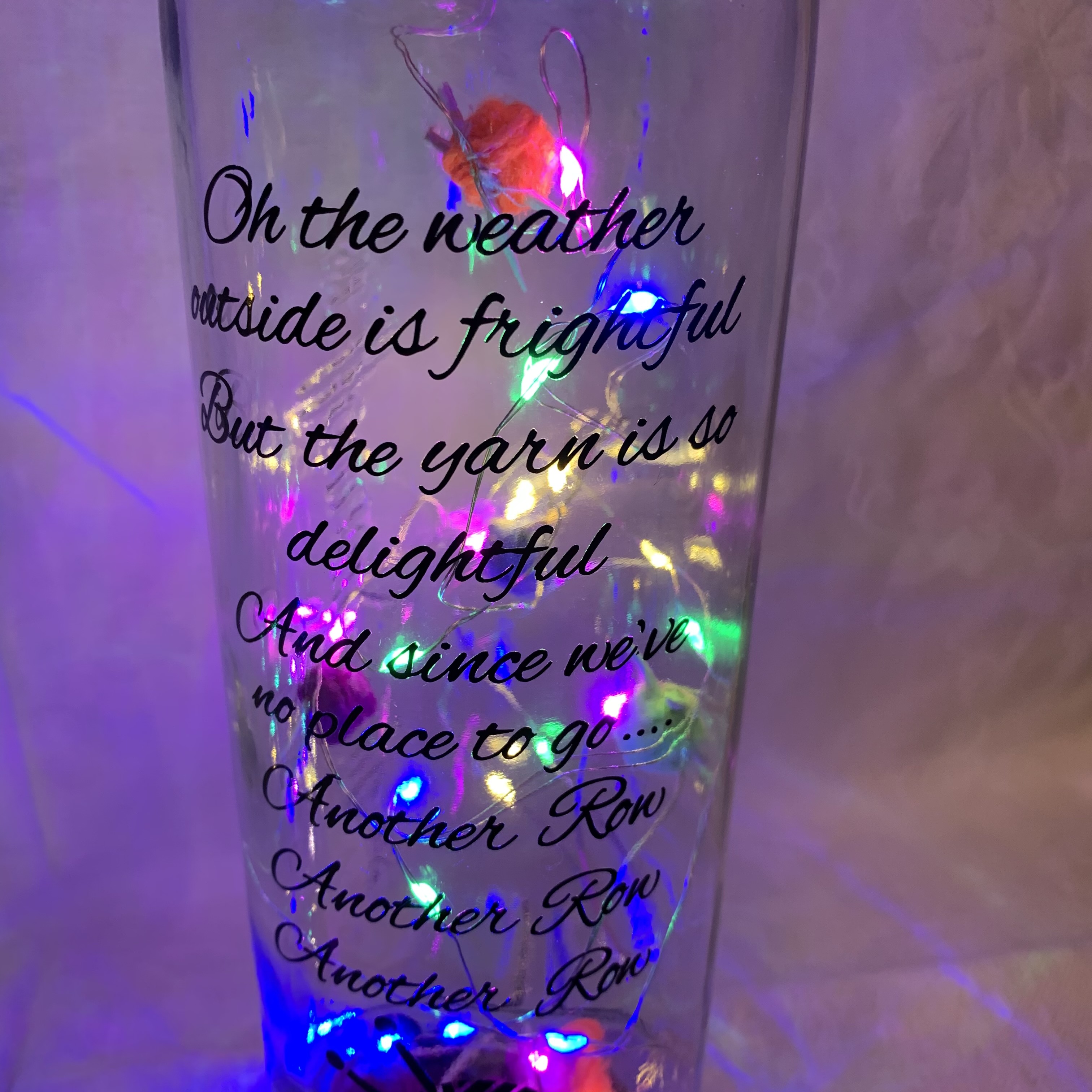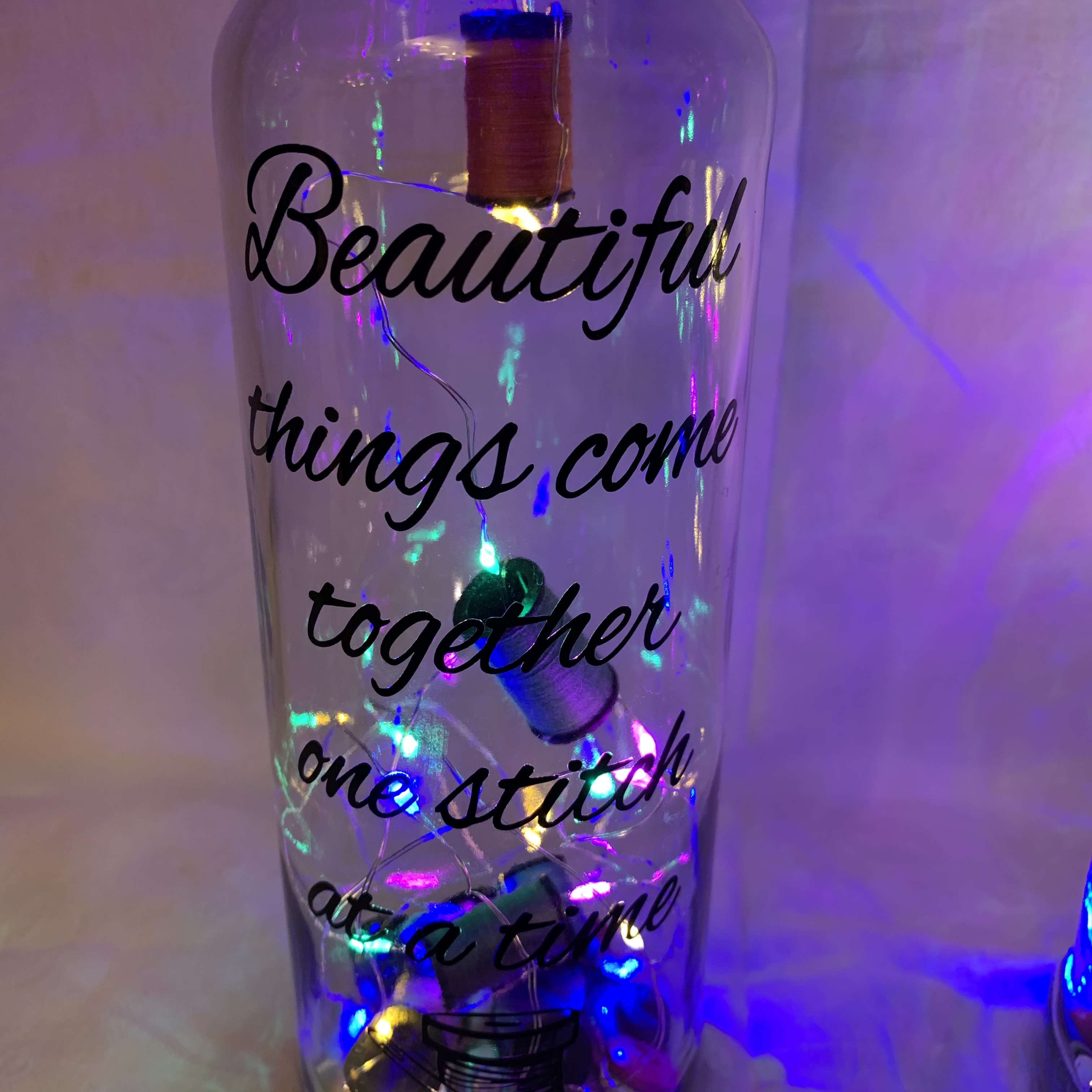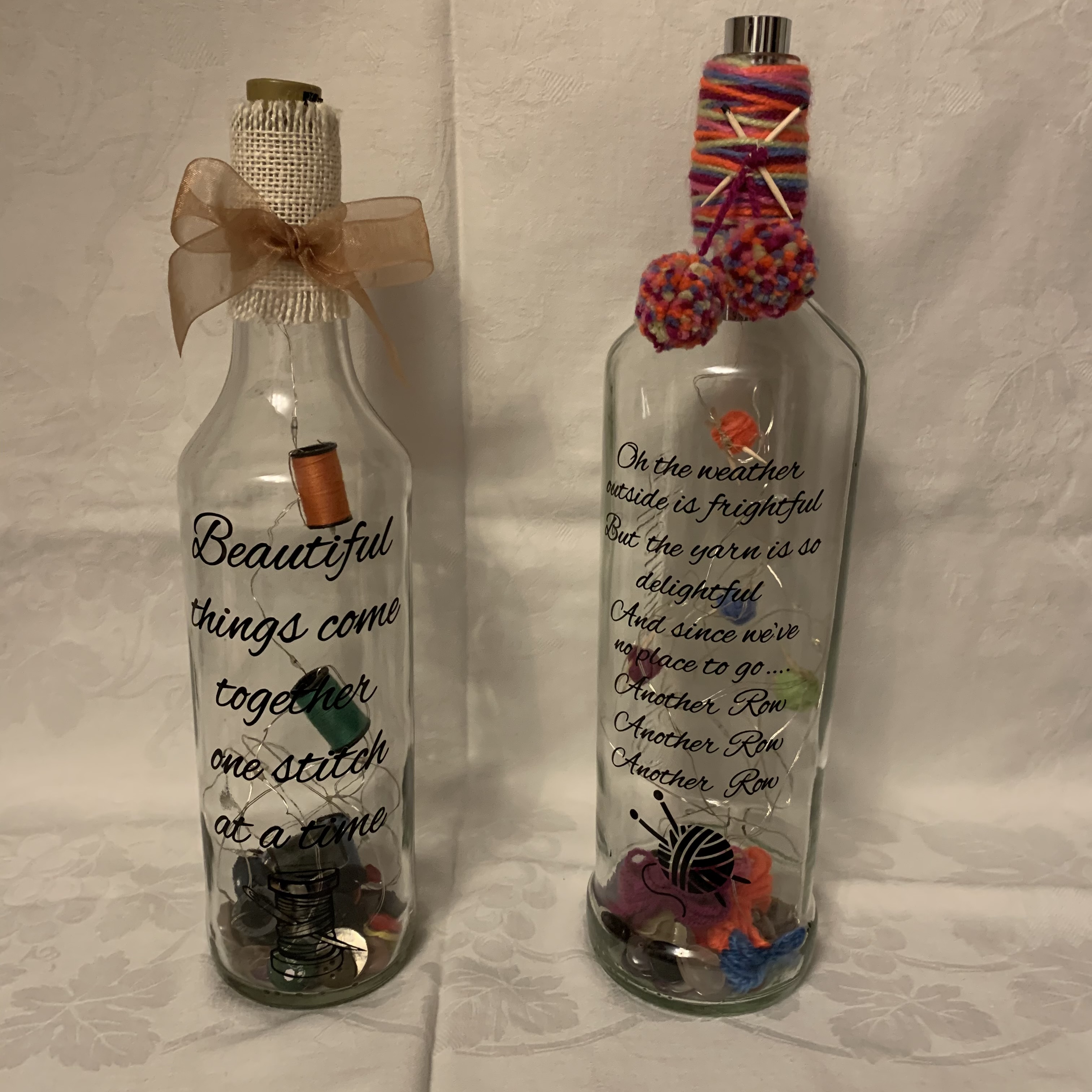 Knitting & Sewing Bottles. The ideal gift for a friend who loves to sew or knit. These bottles are supplied with multi coloured lights with decorations including cotton reels, miniature balls of wool and buttons.