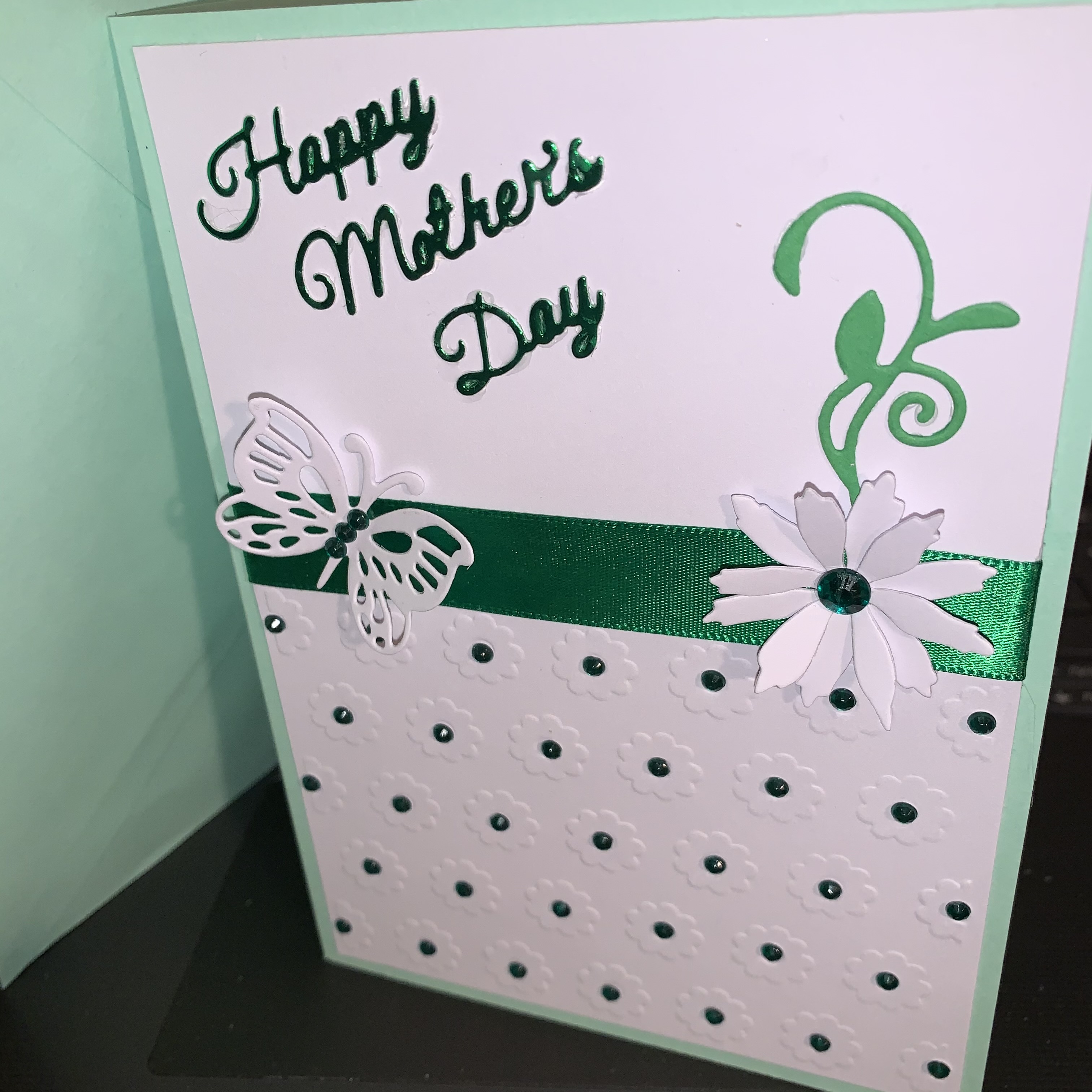 Mother’s Day Card. Peppermint Card with white daisy embossed front with a flower and a butterfly. Completed with Green gem stones.