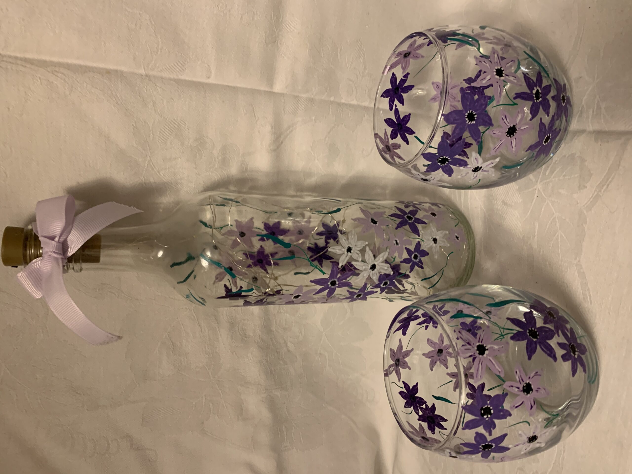 Hand Painted Purple Flowers Bottle and Tea Lights